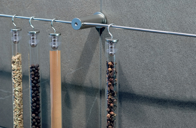 Porta spezie in Pyrex® con gancio scorrevole. Raggio del gancio 5mm., può essere usato con il cavo Ø2mm. o con la barra Ø4mm.